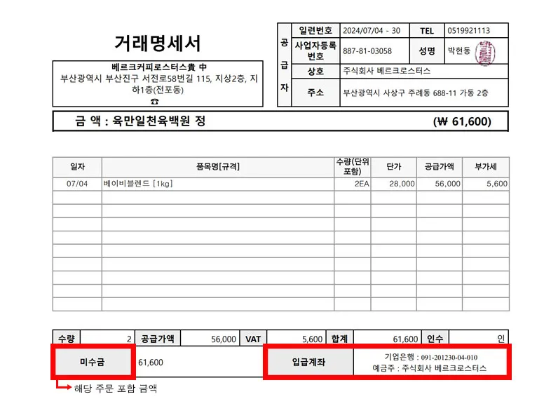 주문 확인 후 명세서 전달. (명세서 하단에 미수 잔액(해당 주문 포함 금액)과 계좌 확인 가능)